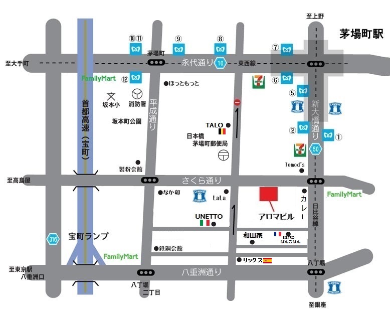 ●東京メトロ日比谷線・東西線 「茅場町」駅 2番出口より徒歩1分 ●JR京葉線・東京メトロ日比谷線 「八丁堀」駅 から徒歩5分 *地図内の@Aの数字は地下鉄「茅場町」駅出口番号
